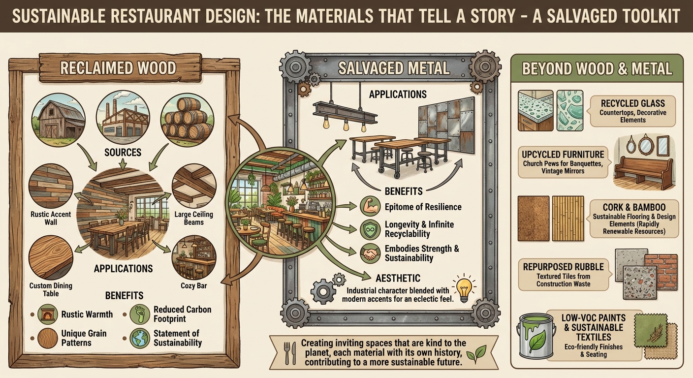 This document explores the concept of using salvaged materials to build unique, character-filled, and cost-effective restaurants with a focus on sustainability. It highlights the historical precedent of reuse, the benefits for designers, restaurateurs, and customers, details common salvaged materials, addresses potential challenges, and outlines future trends in sustainable dining.
